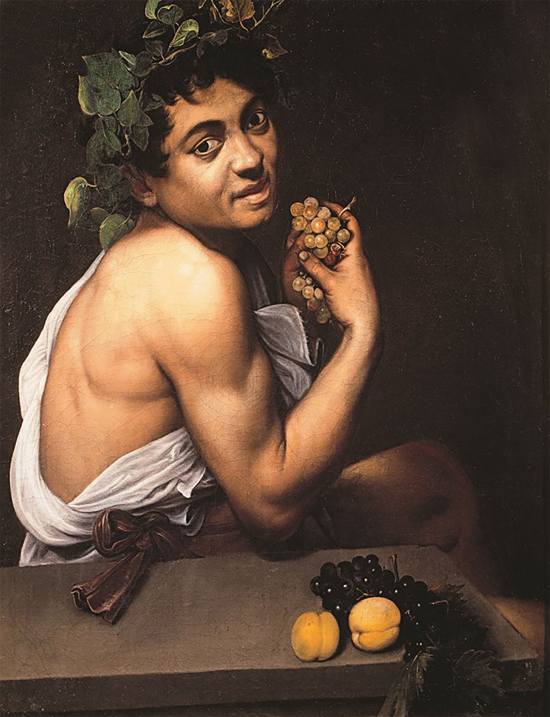 Un autoritratto di Caravaggio realizzato subito dopo il suo ricovero all’ospedale della Consolazione ai piedi del Campidoglio (Oggi sede del Comando del Corpo della Polizia Locale di Roma Capitale) all'epoca nosocomio specializzato nella cura dei "bulli” che a Roma si sfidavano nelle strade e arrivavano feriti. anche quest'opera venne realizzata da caravaggio presso la bottega di Giuseppe Cesari, meglio conosciuto come il Cavalier d'Arpino. In questo dipinto nel quale rappresenta sè stesso, il facinoroso artista sembra porre l'accento sulla malattia di Bacco, sottolineando il pallore del volto e il colore bluastro delle labbra e non attenuando per nulla le imperfezioni del corpo umano. È evidente che, per autoritrarsi, Merisi abbia fatto uso di uno specchio. Su di un piano rettangolare sono disposti alcuni frutti, uva nera e due pesche. Oltre la lastra di pietra si trova il protagonista seduto, Il corpo è rivolto a destra con il busto e le gambe di profilo rispetto al piano pittorico. Intorno al corpo indossa un panno leggero e chiaro annodato sul davanti. Le gambe s'intravedono appena poiché sono coperte dal piano alla vista dell’osservatore. Il braccio destro, invece è completamente esposto, portato in avanti e flesso verso il volto. Nella mano il bacchino stringe un grappolo d’uva bianca. Il viso è rivolto verso il centro ma non completamente. Lo sguardo punta verso sinistra in basso con un’espressione pensierosa e assente. Le labbra pallide e malate accennano ad un sorriso sofferente. Intorno al capo una corona di rami intrecciati, i capelli sono coperti da molte foglie d’edera che scendono verso la schiena. Lo sfondo è bidimensionale e scuro. si presume che l’opera possa rappresentare la resurrezione dalla malattia da cui era reduce michelangelo Merisi.