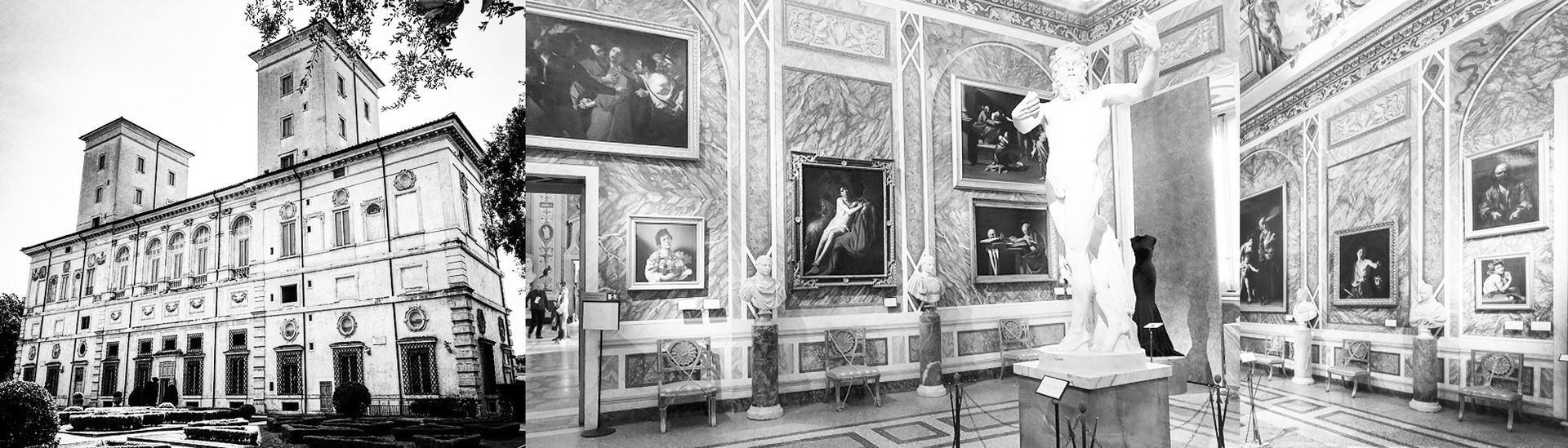 Immersa nel verde della splendida Villa Borghese in piazzale Scipione Borghese 5 la "Galleria Borghese" ospita tuttora gran parte della collezione d'arte iniziata da Scipione Borghese, cardinal nipote di papa Paolo V, cui si deve anche la costruzione della villa stessa. Vi sono esposte opere di Gian Lorenzo Bernini, Agnolo Bronzino, Antonio Canova, Caravaggio, Raffaello, Perugino, Lorenzo Lotto, Antonello da Messina, Cranach, Annibale Carracci, Peter Paul Rubens, Bellini, Tiziano, eccetera, eccetera. Si può considerare unica al mondo per quel che riguarda il numero e l'importanza delle sculture del Bernini e delle tele del Caravaggio. Ecco in particolare quelle del nostro Caravaggio che potrai ammirare esposte nella sontuosa Sala del Sileno: