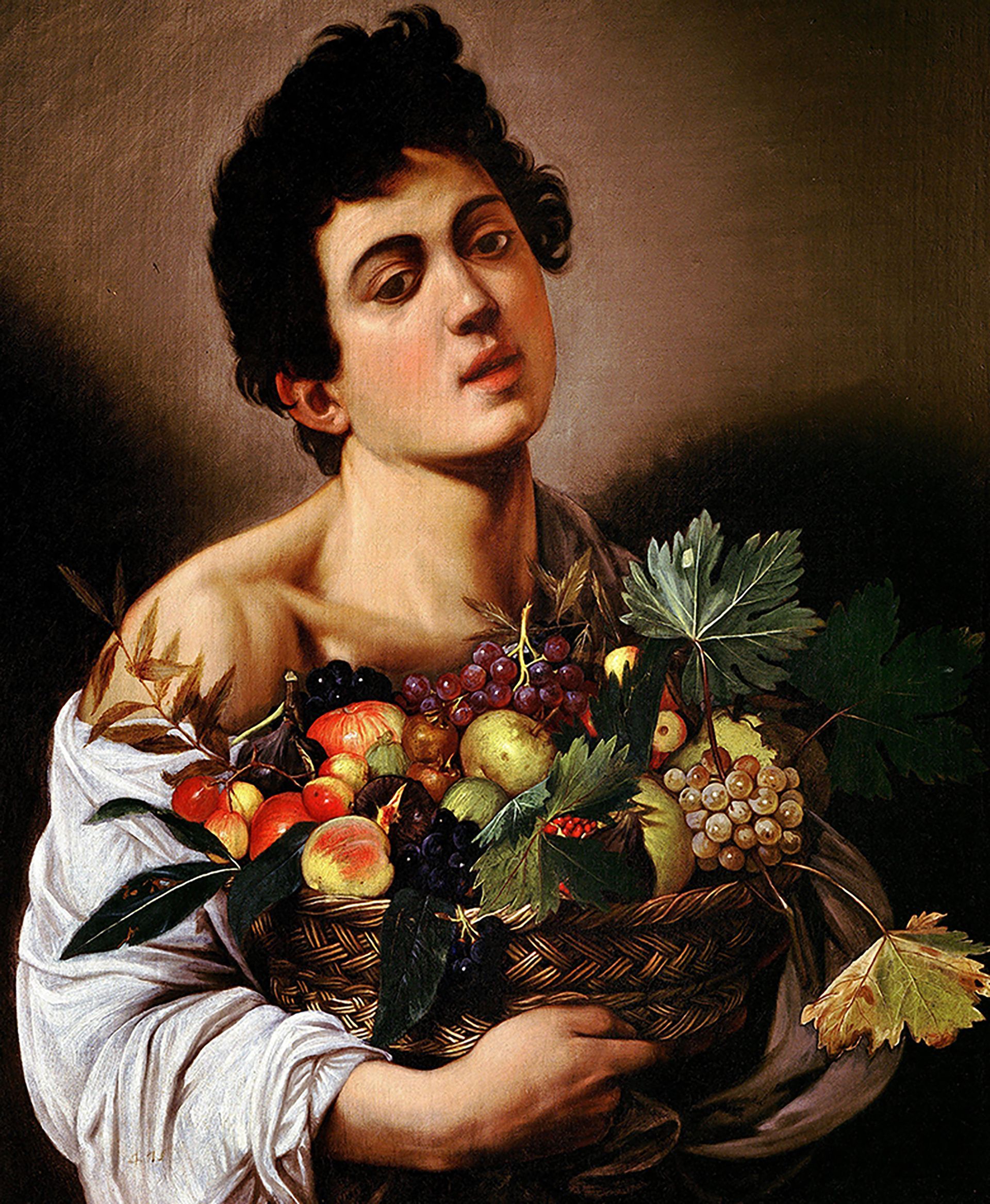 L'opera risale al periodo in cui Michelangelo Merisi lavorava presso la bottega del Cavalier d’Arpino e rappresenta un giovane, in posa di tre quarti mentre regge un canestro colmo di foglie e frutti autunnali: pomi e grappoli d’uva, che presentano le tipiche imperfezioni della natura. Probabilmente una finestra posta in alto sulla sinistra lascia penetrare nella stanza un raggio di luce che illumina sulla parete e diviene protagonista alle spalle del ragazzo riverberandosi sul corpo del giovane e sul canestro colmo di frutta mettendo in risalto le caratteristiche del contenuto: la consistenza delle bucce, le irregolarità, fino all’imperfezione delle foglie secche e macchiate che sbucano in primo piano dalla cesta. Notevole, in quest'opera, l'estremo realismo con cui Caravaggio realizza ogni dettaglio: il fanciullo non è idealizzato e ha i lineamenti propri dei ragazzi del tempo, e perfino la frutta è priva di interpretazioni estetizzanti, presentando tutte quelle imperfezioni che si ritrovano in natura. Sono senza dubbio evidenti la voluta sottile sensualità del ragazzo con la bocca schiusa come se cantasse e il gesto dell’offerta della canestra. Caravaggio concentra la sua attenzione sulla figura umana associata alla natura offerta. l'espressione di sbarbatello del giovane languida e femminea, le labbra semiaperte e rosse carnali, il volto piegato a sinistra, le guance arrossate, la spalla nuda ed esposta, offrono Una lettura in un'ambigua chiave omoerotica che porta a sostenere che il ragazzo non offre la frutta, ma se stesso. Il dipinto, infatti, costituisce una prova mirabile di rappresentazione del vero In un'epoca in cui la religione cattolica considerava i rapporti omosessuali come contrari alla legge di Dio e alla natura, imponendo dure condanne morali. questo capolavoro faceva parte del gruppo di opere che fu requisito nel 1607 a Giuseppe Cesari detto il Cavalier d’Arpino, accusato dagli emissari di Paolo V di evasione fiscale e di possesso illegale di armi da fuoco. Fu lo stesso papa a far dono del dipinto al nipote cardinale Scipione Caffarelli-Borghese, noto e avido collezionista. Fu così che "il fanciullo con canestro di frutta " divenne parte della collezione dell'odierna Galleria Borghese.