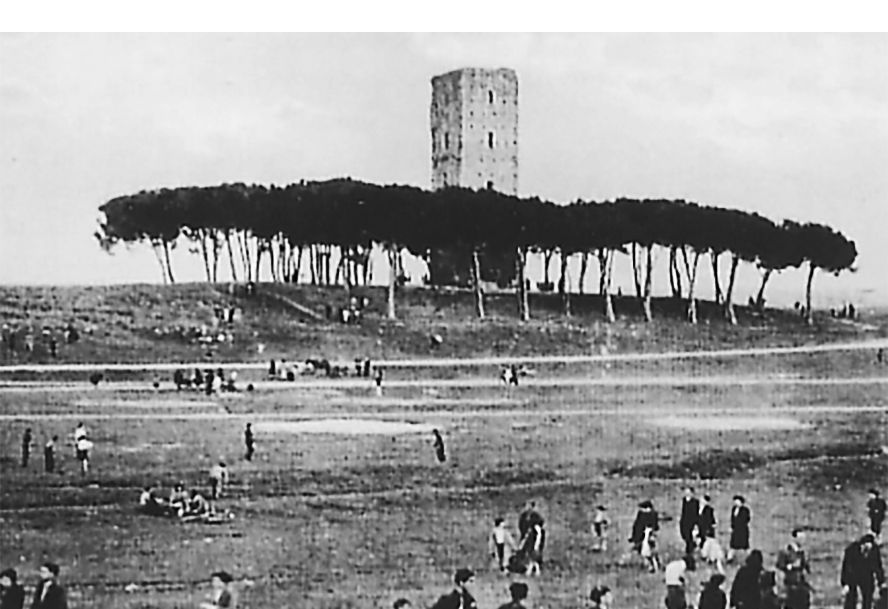 La pineta della Torre di Centocelle qui in una foto scattata nel 1948 all'altezza della «Osteria di Centocelle» durante una scampagnata domenicale. In primo piano l'originario tracciato della Circonvallazione Subaugusta, l'odierna via Palmiro Togliatti, moderna arteria a doppia carreggiata che collega la via Tuscolana alla via Tiburtina tagliando la via Casilina percorrendo la parte bassa di Centocelle da viale della Botanica a via delle Robinie, da via del Fosso di Centocelle a via dell'Incoronata e oltre: un tratto che prima dell'avvento di via Togliatti era percorso da un flusso d’acqua che proveniva dal "fosso dell’acqua mariana". Erano frequenti gli allagamenti e l'acqua diventava putrida e stagnava emanando sgradevoli odori e per questo quel tragitto era chiamato «La Marrana».