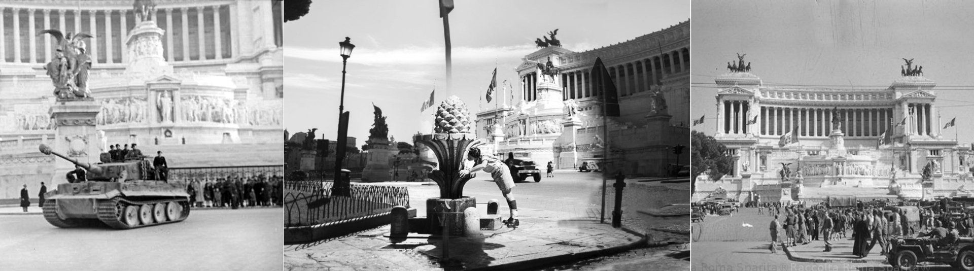 Giugno 1944 le truppe americane del generale Mark Wayne Clark riuscirono a superare le ultime linee difensive dell'esercito tedesco ed entrarono nella città senza incontrare resistenza, ricevendo l'entusiastica accoglienza della popolazione romana. Nell'immagine al centro, un soldato americano si disseta dalla Fontana della Pigna