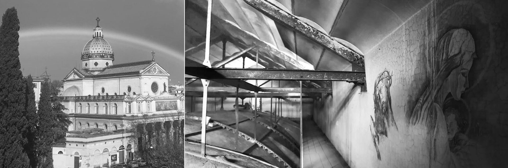 I duri mesi di segregazione dei rifugiati nella chiesa di San Gioacchino che precedettero, in quell’ambiente l’unico accesso era dall’occhione del timpano. Da lì passava tutto grazie a una carrucola, montata e smontata di volta in volta: acqua, cibo, rifiuti e i rifugiati stessi. Nello stanzone un po’ alla volta venne adibito un dignitoso gabinetto, portata la luce elettrica, una radio a valvole per ascoltare sommessamente con cautela cosa succedeva fuori nel mondo, dei fornelletti per riscaldare le vivande, un tavolo e delle sedie.