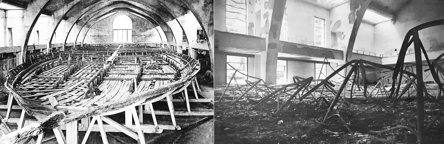 Ma le fatiche, durate 500 anni e finalmente giunte al successo, furono bruscamente vanificate nella notte del 30 maggio del 1944 quando, durante un attacco dei cannoni americani, il museo prese misteriosamente fuoco e, con esso, le navi. Lo sgomento per la perdita dei preziosissimi reperti fu immenso. Le navi erano perse per sempre. Si salvarono solo le parti asportabili, come le ancore e le decorazioni di bronzo o i frammenti di mosaico che erano state previdentemente portate a Roma l'anno prima.