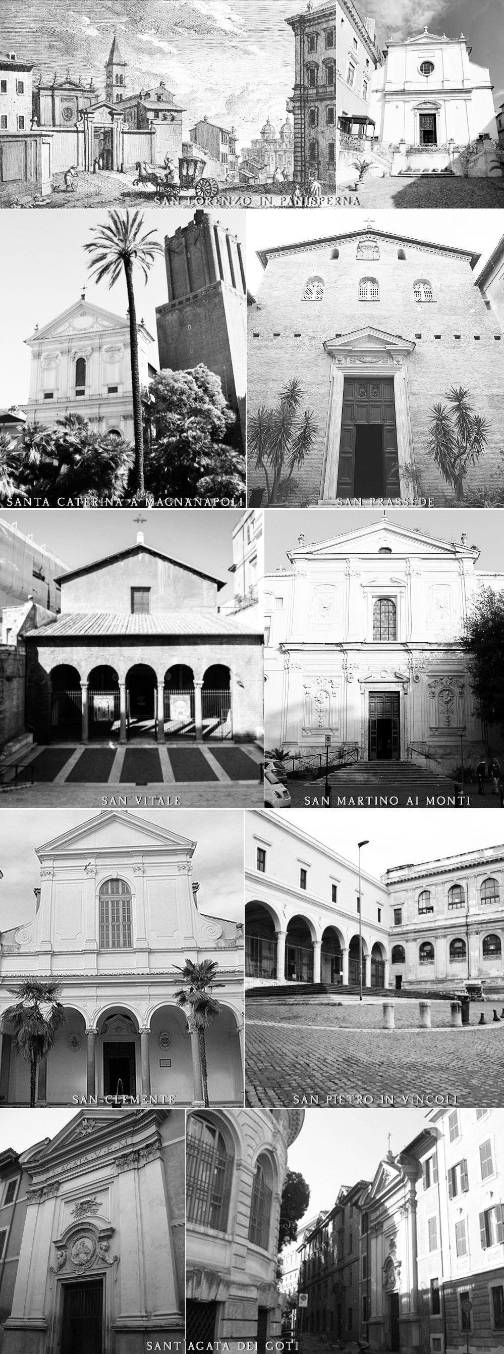 E la chiesa di Santa Caterina, quasi al riparo della Torre delle Milizie con la celebre Gloria in stucco nel prezioso tabernacolo? Giocondamente dedicato all'amor fedele e alla gioia della vita e a alla grazia degli innamorati, è un angolo della chiesa di San Prassede. L'urna posta sopra l'architrave d'ingresso, racchiude le ossa di San Valentino, protettore appunto degli innamorati. La chiesa è antichissima e sorge sopra la Domus Pudentium, la casa della famiglia senatoriale dei Pudenti, presso la quale dimorò l'apostolo Pietro verso il 40ta dell'era Cristiana. Nella chiesa si conserva anche un rocco della colonna della Flagellazione di Gesù e un quadro di Giulio Romano che ne riproduce la scena. Quasi completamente inosservata, su via Nazionale, è la "basilica paleocristiana" di San Vitale; eppure è un edificio artistico notevole, con il suo portale artistico del primo Rinascimento, e il soffitto a cassettoni e le pitture del Cavalier d'Arpino. È una delle basiliche artistiche della città, fondata come fu nel 401 da papa Innocenzio I probabilmente sul luogo di un tempio romano. San Martino ai monti è uno scrigno segreto di silenzi mistici. Appartiene al titolo «in Equizio» del quarto secolo e papa Silvestro vi tenne un solenne concilio in cui partecipò l'imperatore Costantino. Anche San Clemente risale ai tempi costantiniani, ed è spettacolare la suggestione che sale da questi interni, per le due chiese sovrapposte e la presenza del mistero tutta riunita nel Mitreo, una cella dedicata al culto di Mitra che si era propagata alla fine dell'impero. Calcarono questi venerabili marmi dei pavimenti le pantofole di papa San Zosimo (anno 417) ed anche quelle di Gregorio Magno: i monaci di San Benedetto ne custodiscono ancora il ricordo. La leggenda delle catene di San Pietro ci porta direttamente a San Pietro in Vincoli dove l'imperatrice Eudossia le volle conservare. Papa Giulio II fu il grande artefice dell'attuale architettura sotto le cui volte «parla» ancora nel marmo lunense, il famoso Mosè di Michelangelo.